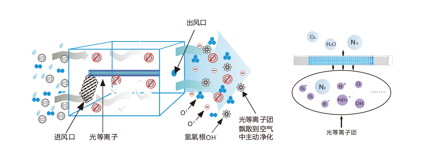 “BIOSUN百歐森”定壓環(huán)流光等離子(PHOTOPLASMA)專利技術(shù),利用特殊材料及工藝制造的光等離子管,在特定波段下輻射能量,將光源周圍空氣中的水氣分子(H2O)、氧氣分子(O2)轉(zhuǎn)化為物質(zhì)第四種形態(tài)等離子態(tài),光等離子在空氣中主動(dòng)奪取甲醛分子、揮發(fā)性有機(jī)物TVOC分子、細(xì)菌蛋白質(zhì)等有害物質(zhì)結(jié)構(gòu)中氫(H) 元素,讓自身還原穩(wěn)定,達(dá)到改變有害物質(zhì)結(jié)構(gòu)的目的,實(shí)現(xiàn)處理污染物的凈化效果。等離子團(tuán)游離在空氣中,能徹底分解有害物質(zhì),還原自身成為水和二氧化碳。