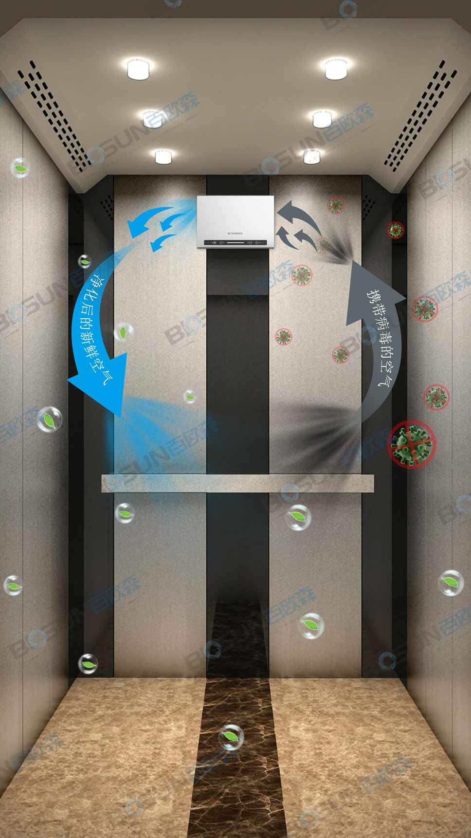 百歐森電梯空氣殺菌凈化系統專門為電梯小空間定制,采用百歐森獨有的“光等離子凈化技術”快速殺滅電梯空間和物體表面的細菌病毒、TVOC等有害物質,同時有效去除異味,為電梯提供優質的空氣環境和疫情防疫措施。
